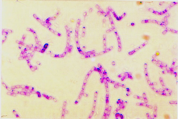 炭疽桿菌 系一需氧或兼性厭氧無鞭毛的粗大桿菌,長4一8μm,寬1一15μm 。菌體兩端平削呈竹節狀長鏈排列,革蘭染色陽性。在人體內有莢膜形成並具較強致病性,無毒菌株不產生莢膜。炭疽桿菌生活力強,在一般培養基上生長良好。