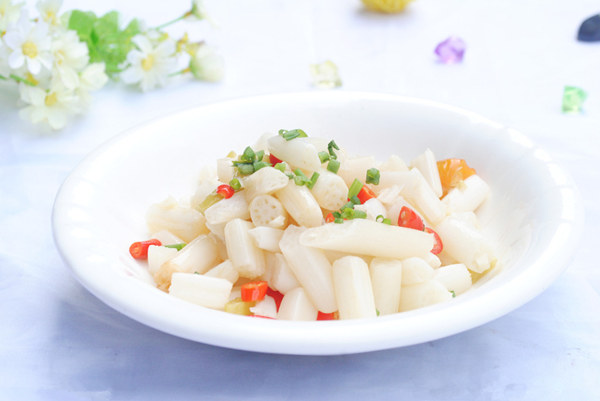 藕帶的營養價值強健胃粘膜:維生素C和蛋白質一起發揮效用,能結合各種細胞,促進骨膠原的生成,起到強健胃粘膜的作用。預防貧血:預防貧血,協助肝臟的運動。改善腸胃:單寧具有消炎和收斂的作用,改善腸胃疲勞。蓮藕還有含有黏蛋白的一種糖類蛋白質,能促進蛋白質和脂肪的消化,因此可以減輕腸胃負擔。止血:蓮藕對血小板減少、性紫癜有一定療效。對血熱引起的出血也有療效。另外藕粉調補脾腎、滋腎養肝、補髓益血。接下來,就來看看藕帶要怎麼吃吧。藕帶的傢常吃法酸辣藕帶食材:藕帶、幹辣椒絲、薑絲、鹽、醋。做法:新鮮藕帶洗凈斜切成寸段