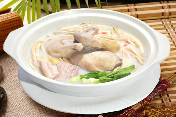 筍幹老鴨煲材料:老鴨1隻(約1500克),火腿300克,天目山筍幹650克,生雞爪100克,深山鮮粽葉200克,配料若幹。做法:1、老鴨洗凈後放入沸水中用中火汆15分鐘;2、雞爪洗凈,用剪刀剪去腳趾甲,然後用20克紹酒、8克鹽、8克味精醃漬30分鐘;4、將雞爪放入砂鍋中,放入蔥、薑各10克,750克上湯,大火燒開後小火燒30分鐘,取出。5、將火腿切成厚0.3厘米的薄片備用;6、天目山筍幹放入50 溫水中浸泡30分鐘,取出備用。7、在砂鍋裡加入蔥、薑、鮮